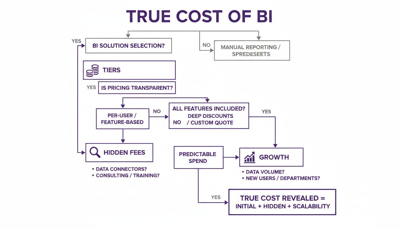 > The real cost of a BI tool isn't what you pay in month one. It's what you'll be paying in month twelve, after you've discovered all the "premium" features you suddenly can't live without.