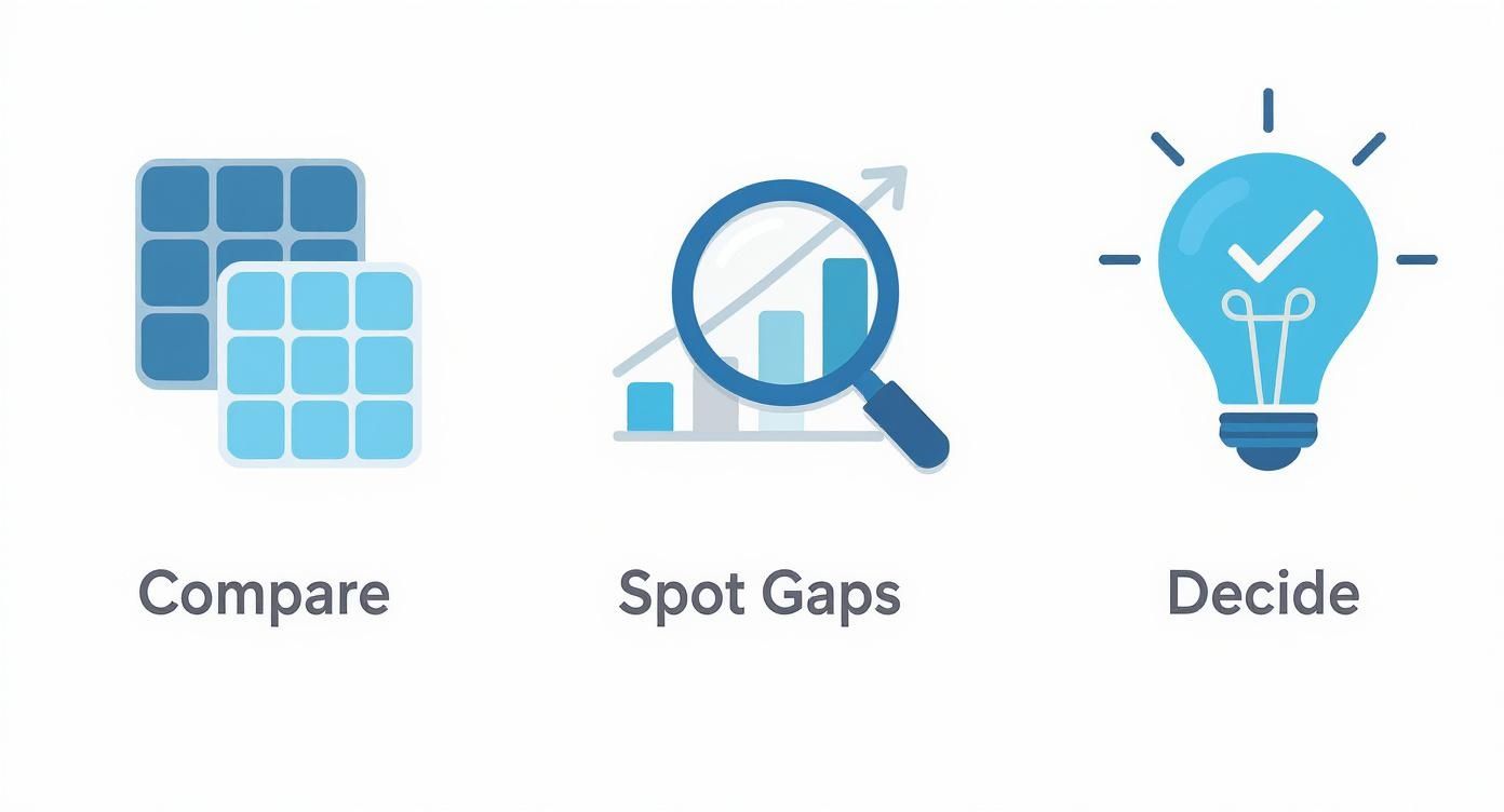 The process is pretty straightforward: compare your offerings, find where the market has gaps, and then decide on your next move.