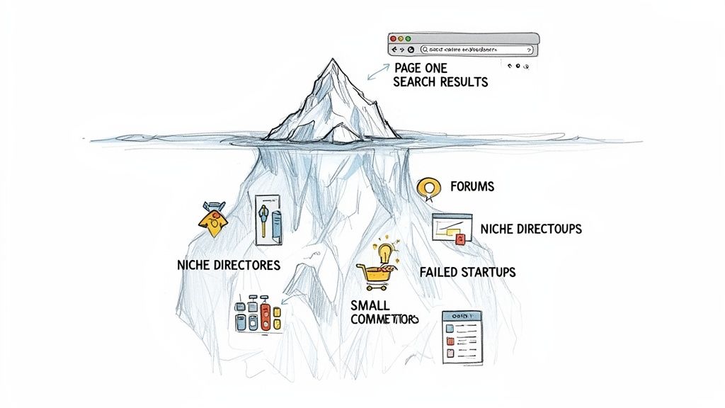 The real gold is buried where your customers actually talk: niche forums, specific subreddits, and little-known industry directories. To dig up those competitors, you have to learn to speak Google's language.